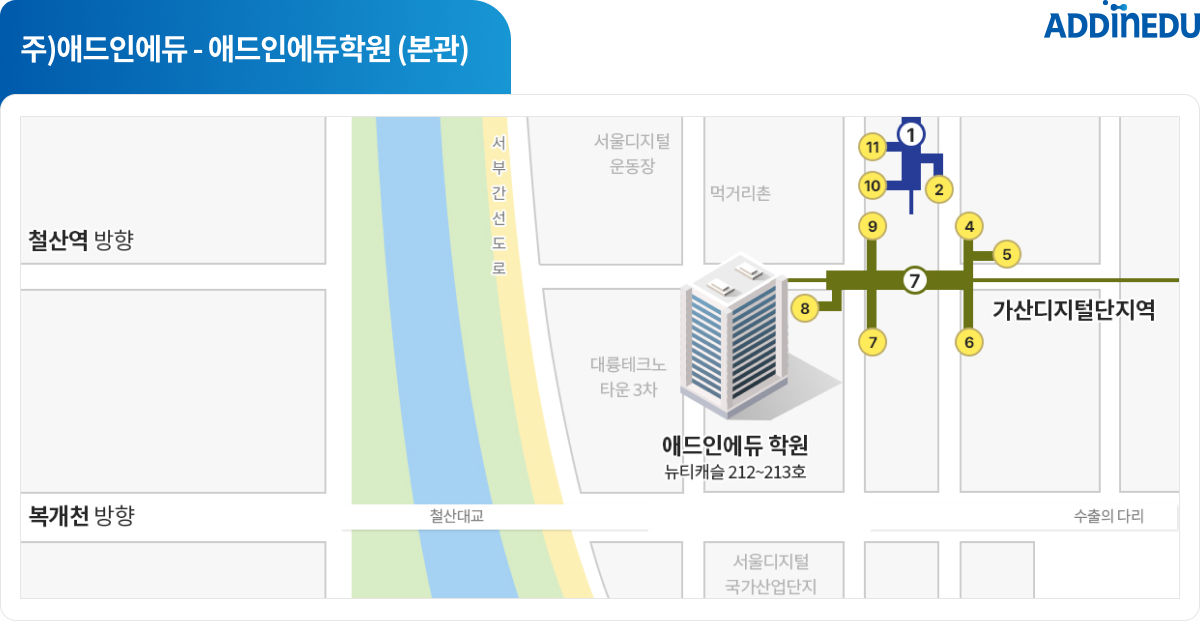 - 본관(뉴티) : 서울특별시 금천구 가산디지털2로 108 뉴T캐슬 212~213호, ㈜애드인에듀(애드인에듀 학원)